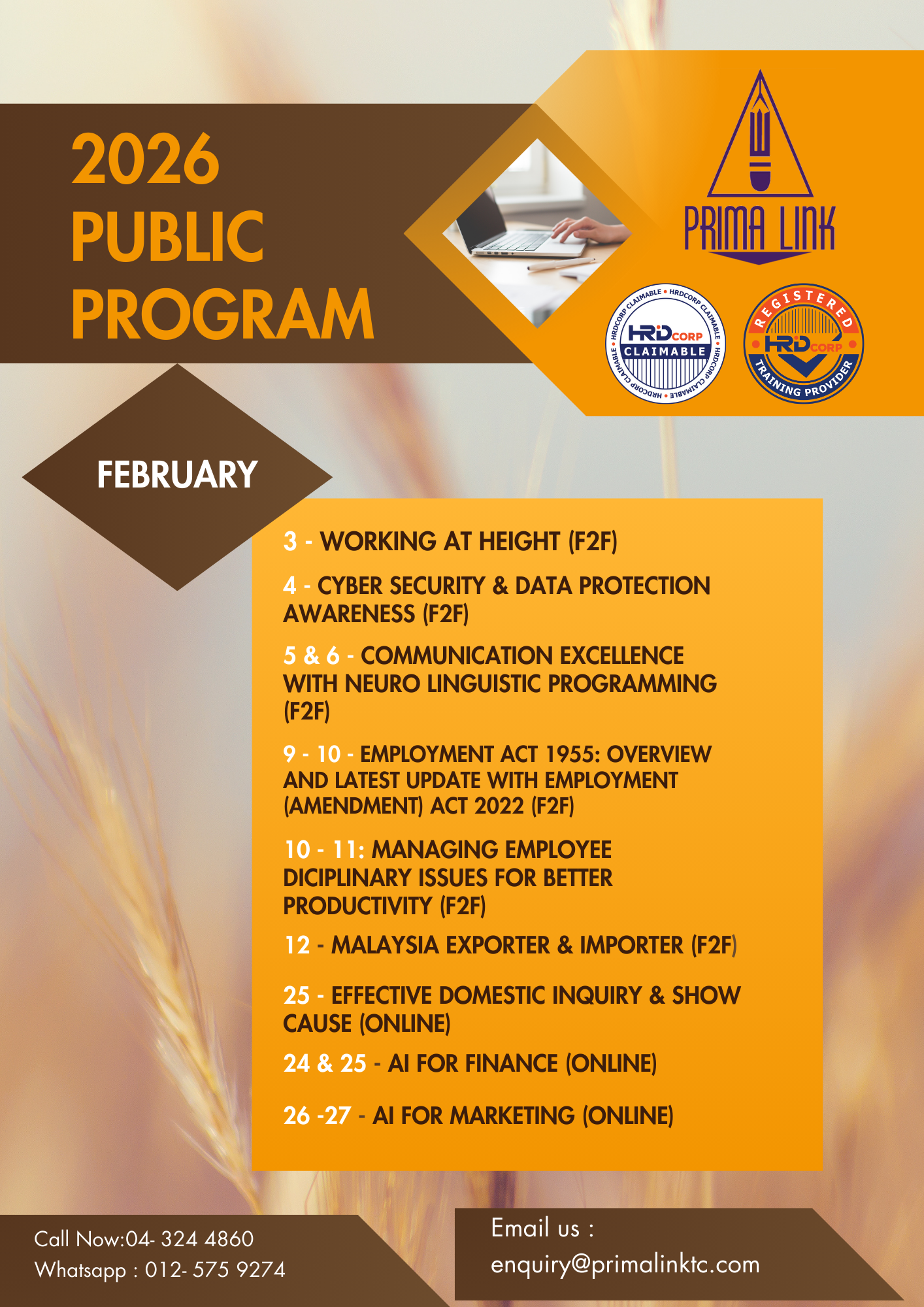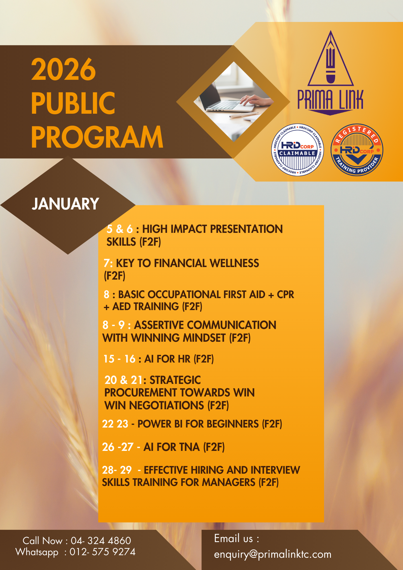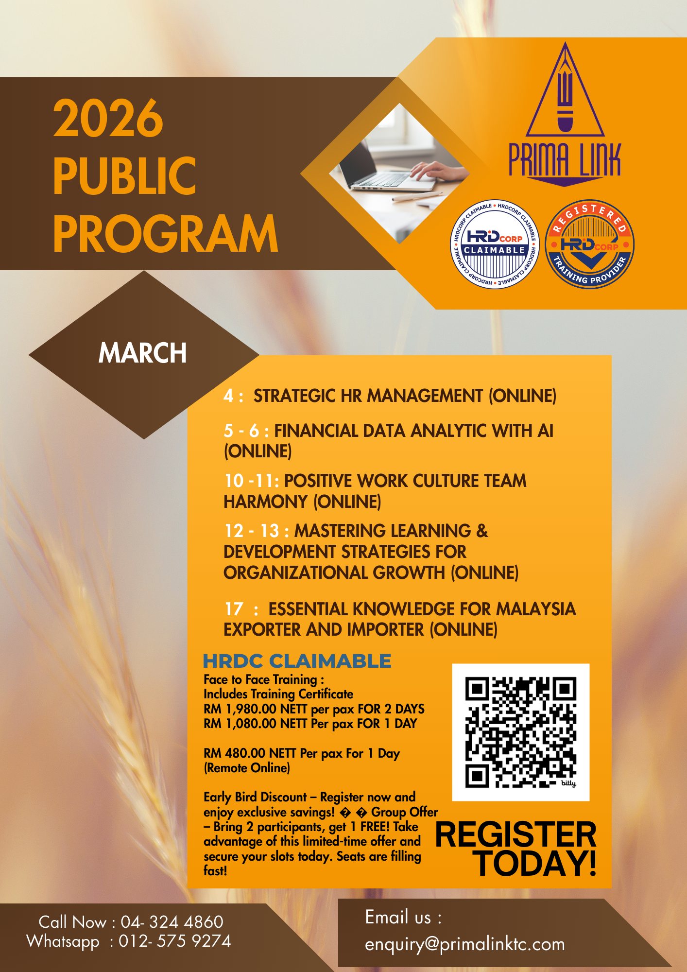 If you are interested to attend any training programs that are not in the above list, please contact our public program coordinator at 04-3244860 or email enquiry@primalinktc.com